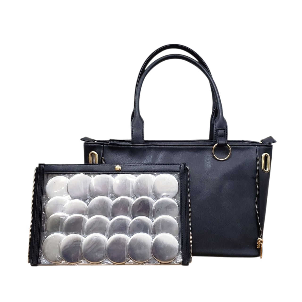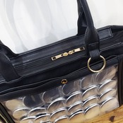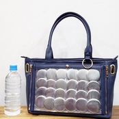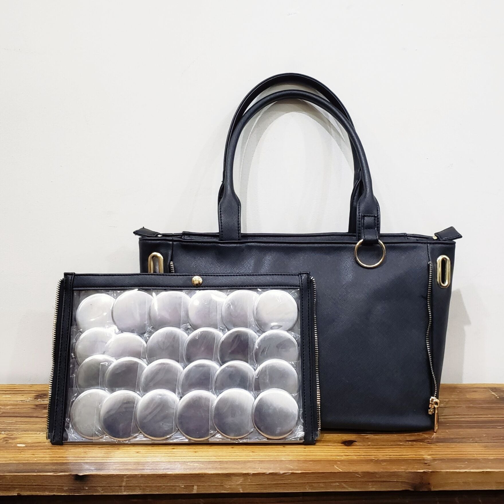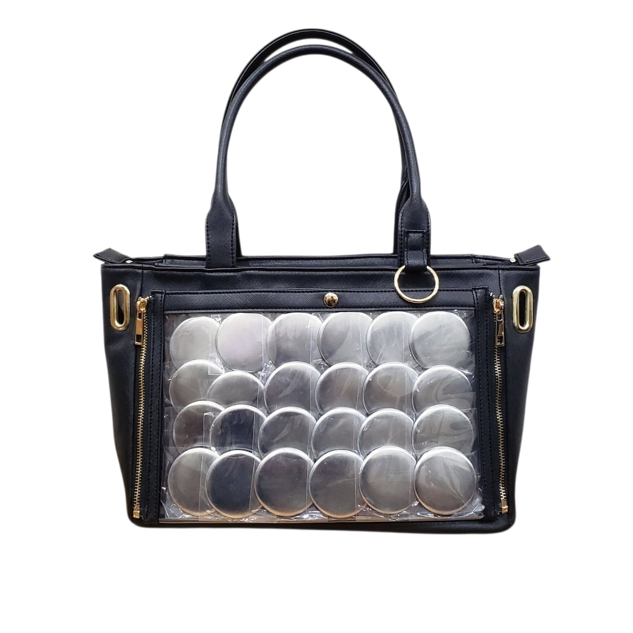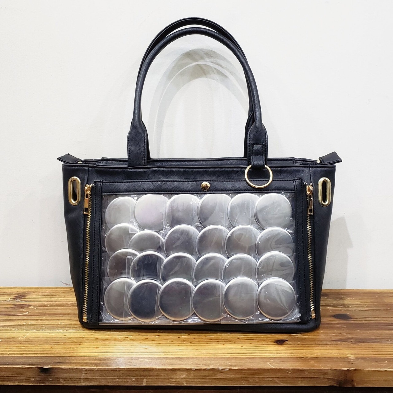 前面のビニール面(缶バッジ等を収納する部分)をサイドファスナーで脱着回転して普段にも使用できる機能を付属した痛土台バッグです。